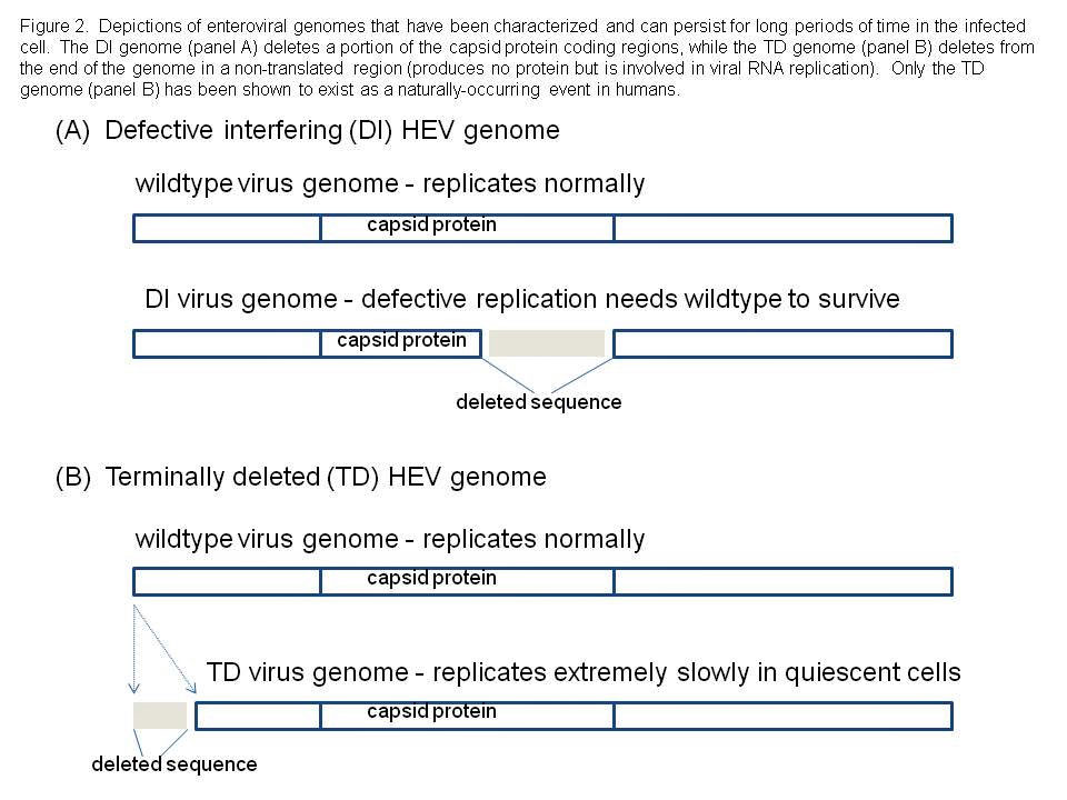These results provided an answer to the conundrum of failing to find cytopathic virus in myocarditic heart samples despite the ability to find viral RNA. Indeed, virus (in TD form) does exist in such samples but because the TD populations replicate so slowly and produce so little virus, they are difficult to detect. However, because the defect is not in a part of the viral genome that makes viral proteins, they do make all the viral proteins and even virus particles. But what does the finding of TD genomes mean for HEV disease?