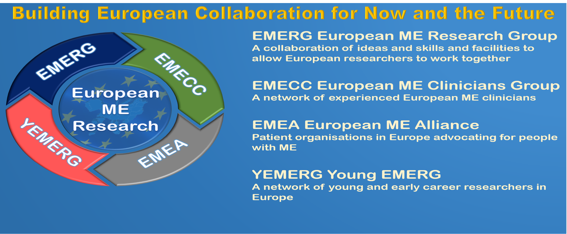 EMERG is supported by the European ME patient groups and charities within the European ME Alliance (EMEA) to provide a powerful combination of campaigning, raising of awareness, building new research and accumulation of data based on collaboration and sharing of experiences and knowledge, which would allow rapid progress in the building up a strategy of high-quality research into ME.