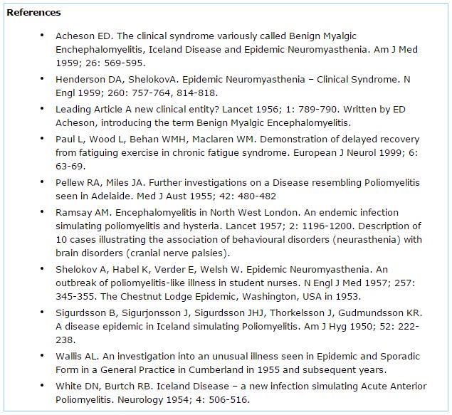 In conclusion, Iceland Disease and ME/NM is a muscle/brain disorder, which occurs as clusters of cases in families, in institutions such as hospitals or schools, in districts as far apart as the northern townships in Iceland and Adelaide in Australia or sporadically. It is an infectious disease with an incubation period of 5 to 8 days. Acheson in 1959 used the expression "in a greater or lesser degree" to describe "the symptoms and signs of damage to the brain and spinal cord" in this disease.