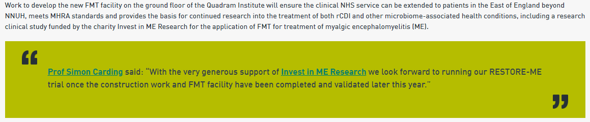 The long awaited announcement has come today from Quadram Institute Bioscience in Norwich Research Park [1] of the new investment in the new Microbiota Replacement Therapy (MRT) - also called Faecal Microbiota Transplant (FMT) - facility that is being set up for the UK clinical trial at the Quadram and which is being funded by Invest in ME Research [2].