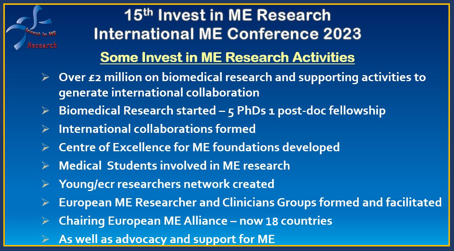 The name of our charity truly becomes the main calling for all interested in resolving this disease. What better slogan to use at this point in time than the one that this small charity has uniquely been promoting for so long. Time to #InvestinMEresearch.