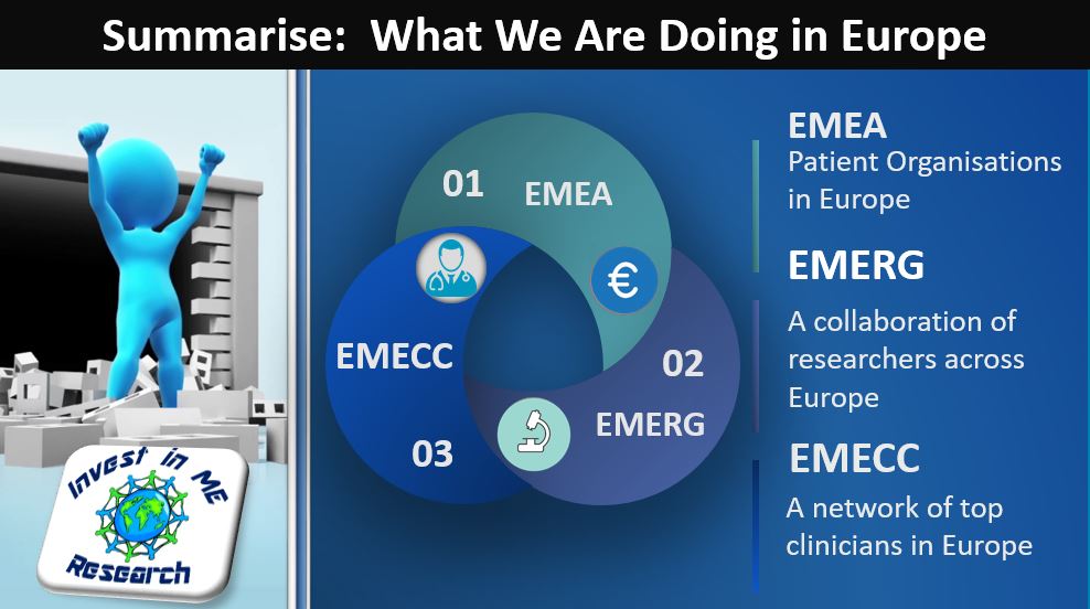 In 2015 Invest in ME Research formed (the European ME Research Group (#EMERG) to create a solid network and foundation for European collaboration and the creation of a joint strategy of biomedical research into ME.