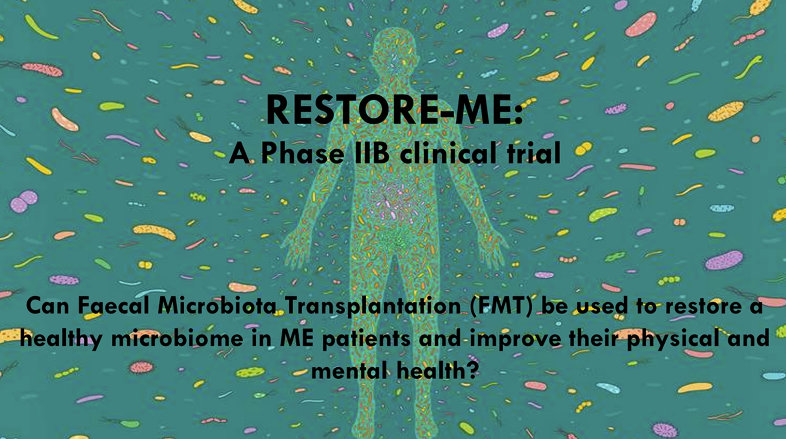 RESTORE-ME is a unique UK active clinical trial specifically for ME, testing microbiota replacement therapy (faecal microbiota transplantation) as a potential treatment. This study aims to determine whether carefully screened gut microbiota can safely improve symptoms and quality of life.